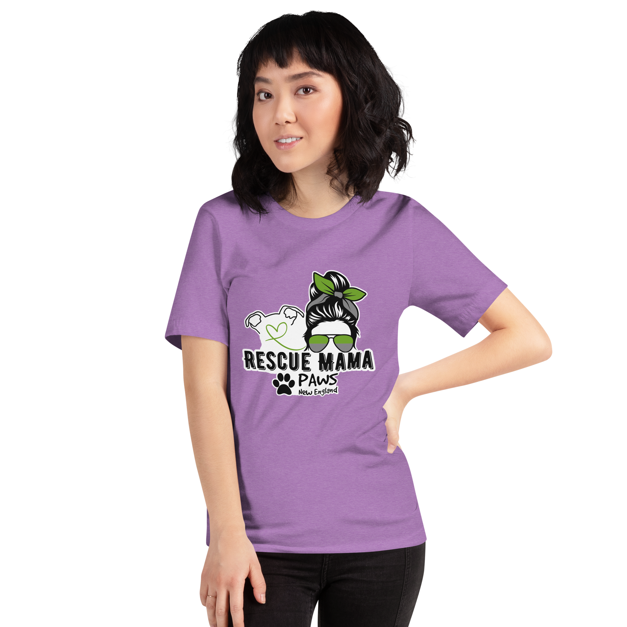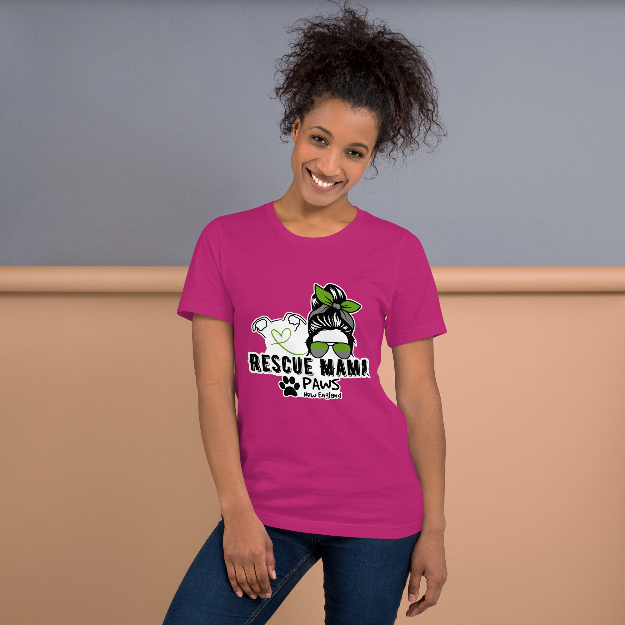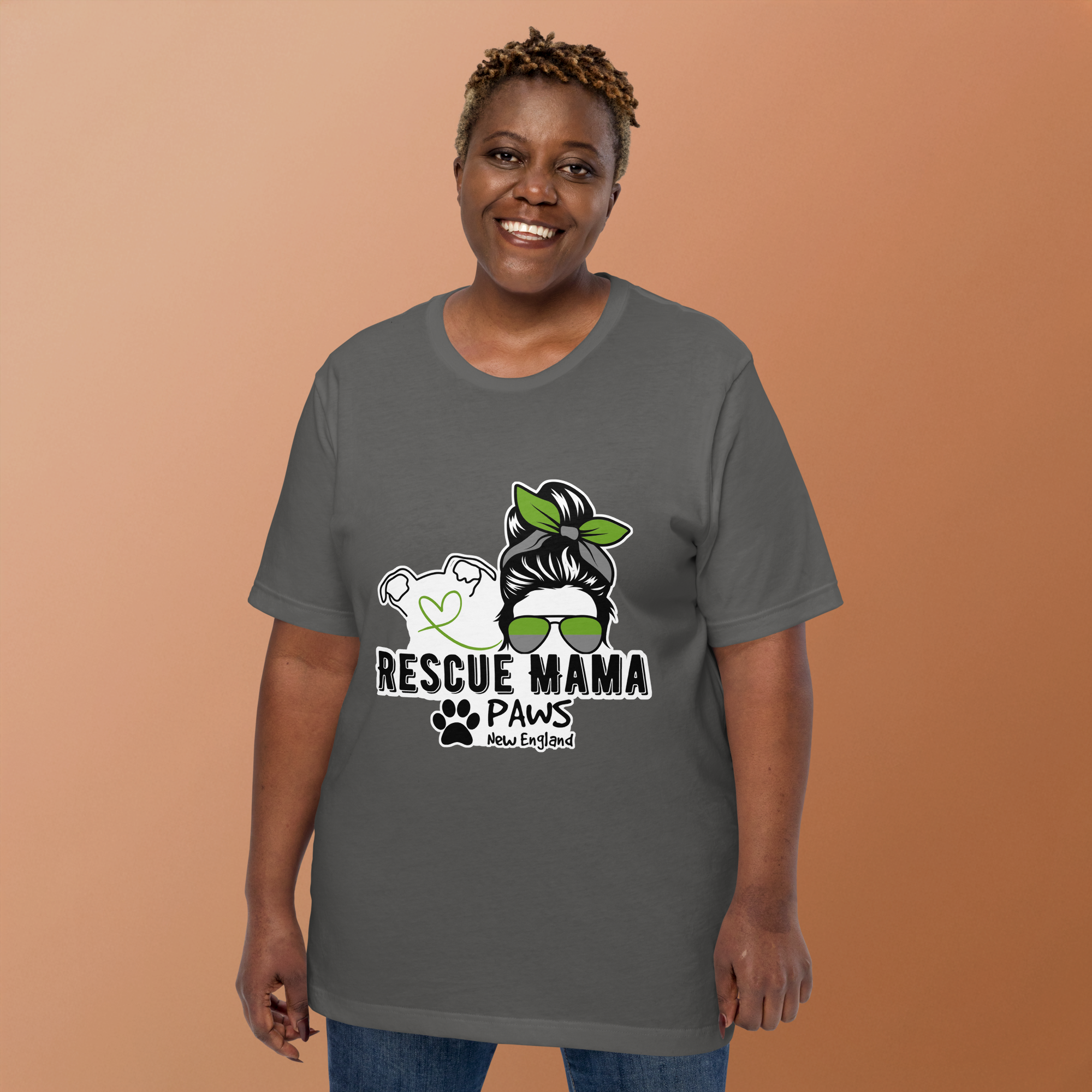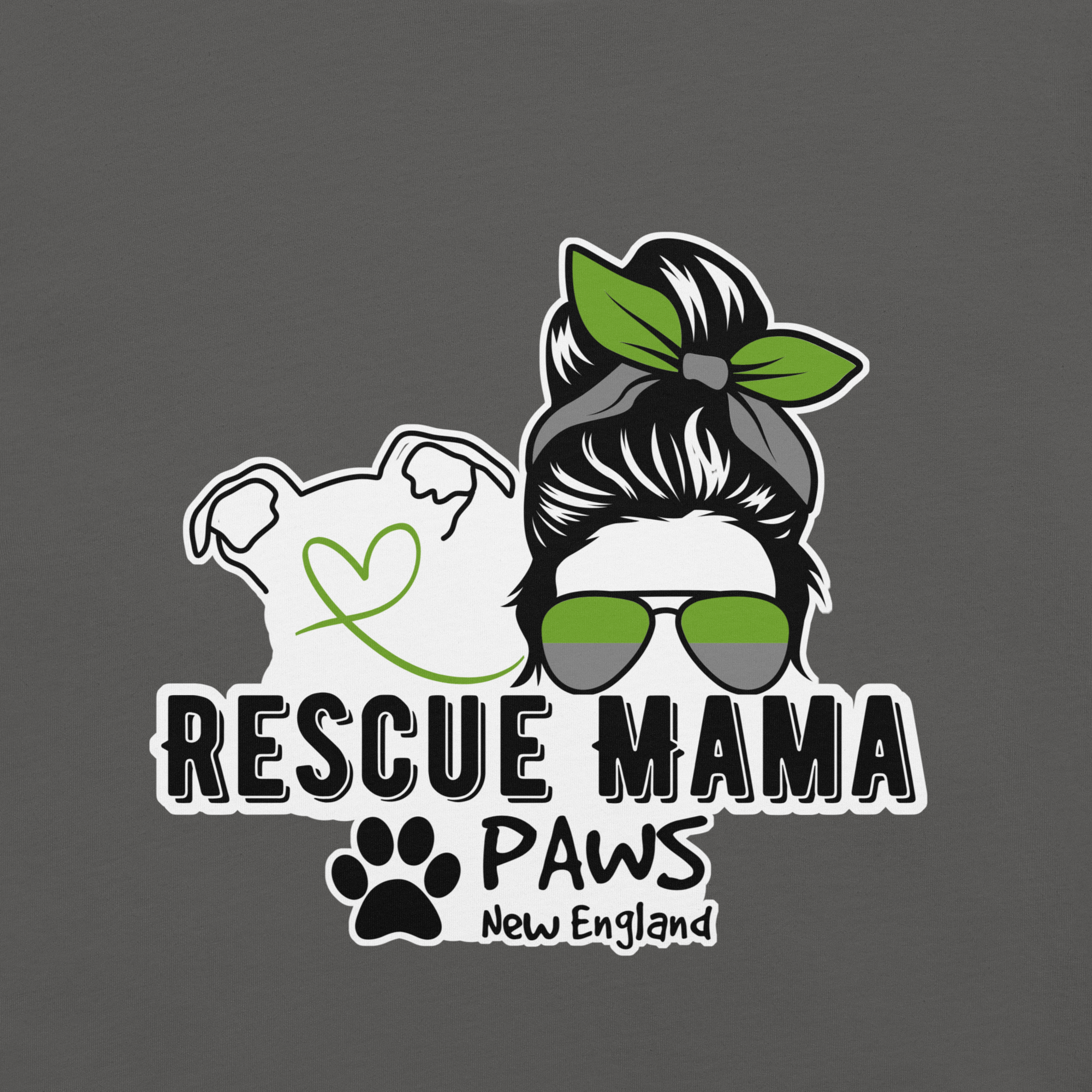 Featuring a striking silhouette of a confident woman in sunglasses, paired with a loyal pup whose heart-shaped nose says it all, this piece is brought to life in signature PAWS New England colors—a subtle but powerful nod to the rescue community.