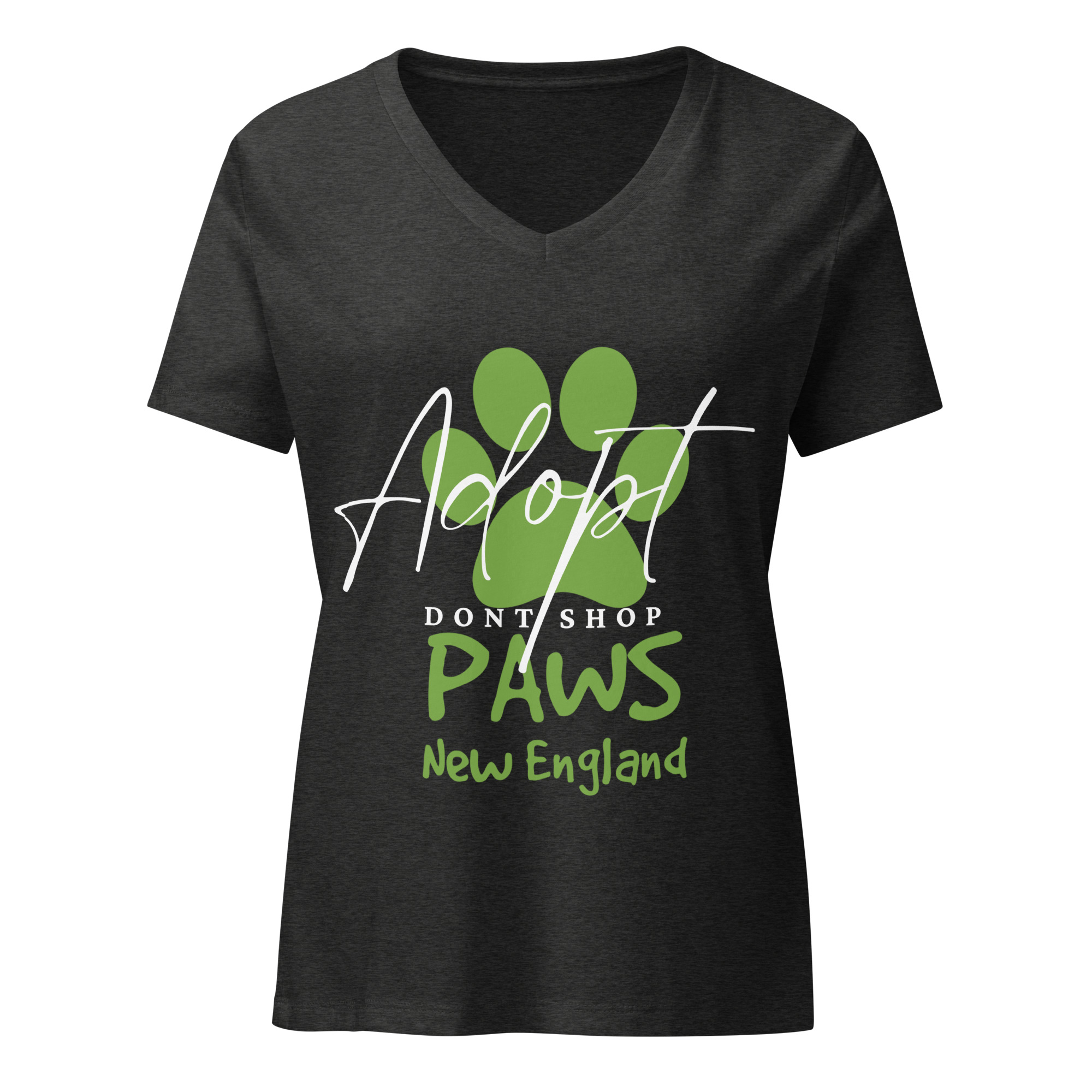 This soft, flattering V-neck features the classic PAWS New England logo with “Adopt Don’t Shop” boldly overlaid on the center front, with a smaller PAWS logo centered just below the collar. It’s a powerful message — from every angle.