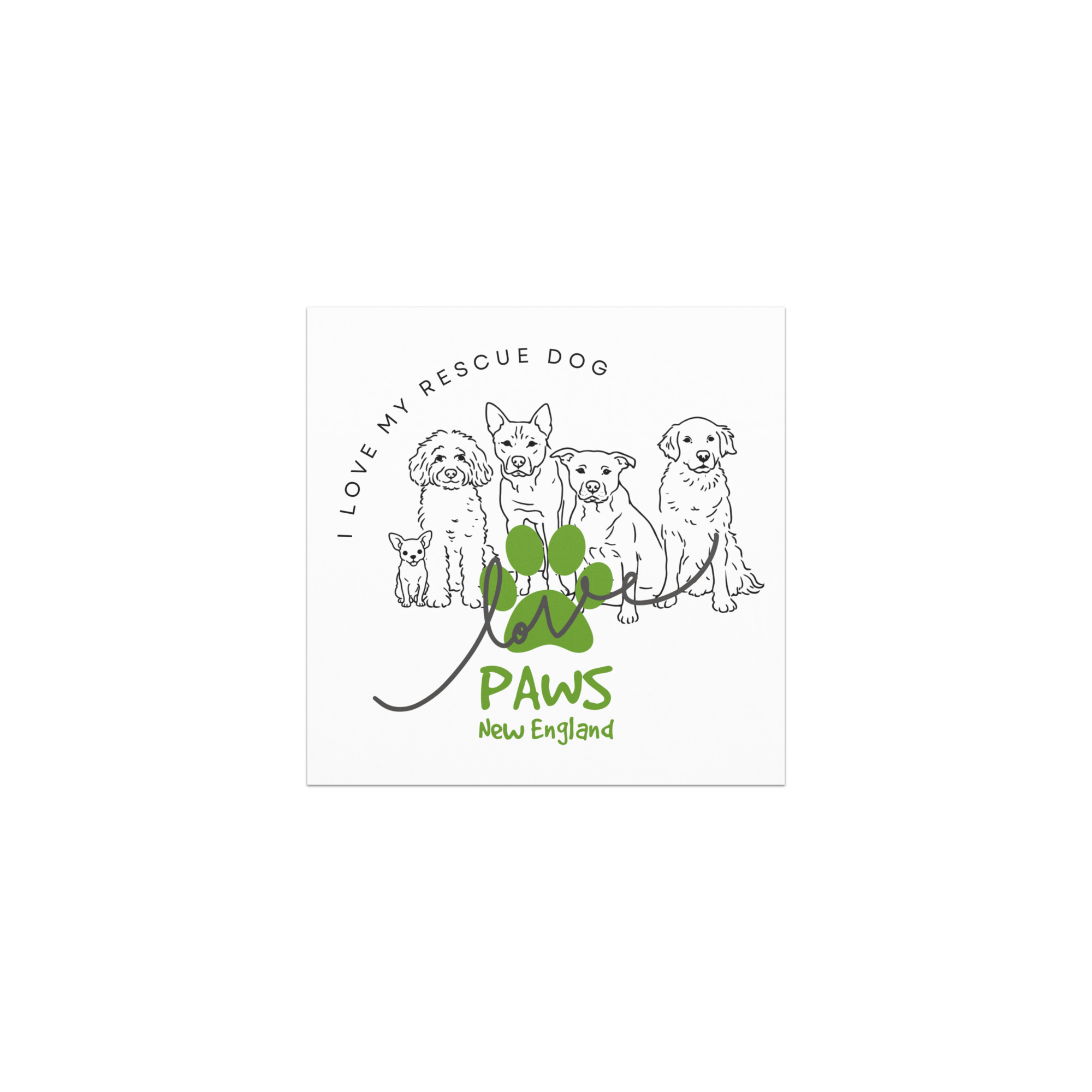 This durable car magnet features the playful “I Love My Rescue Dog” design with five rescue dogs — including special needs pup Gravity and his pals — along with the PAWS logo and a soft “love” overlay.
